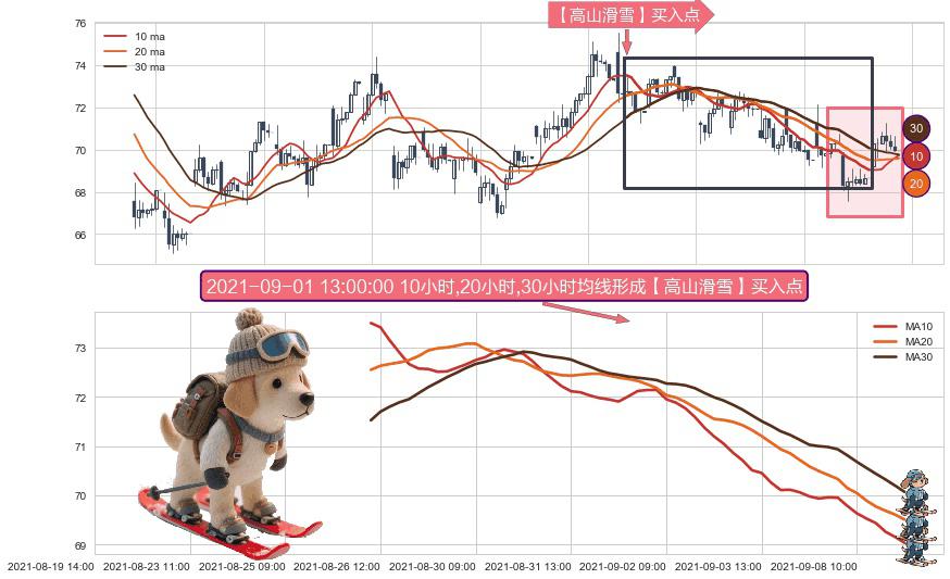 ⚀ 2021-08-26 11:00:00小时-2021-09-08 15:00:00小时显现 10小时-20小时-30小时均线 【高山滑雪】买入点 看多信号,后市看涨,买入