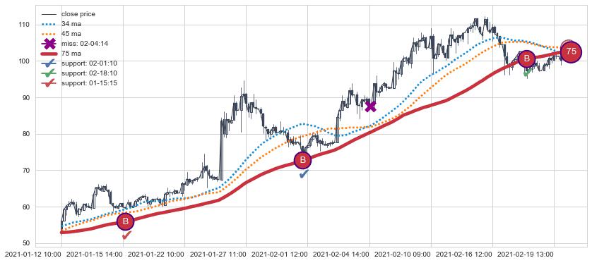 ⚁ MA3和MA8走势平行,且始终保持在短距离内,MA21始终在短中期均线上方,与短中期均线保持一定的距离,微微下行