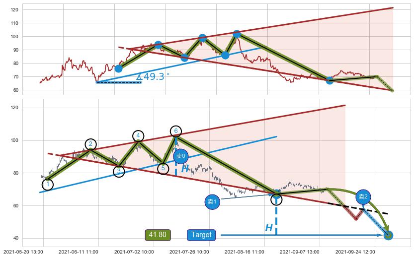 ➢ 最小反转跌幅→𝐇: 25.20 (逐步抬高阻力斜边最后的阻力点⑥与支撑边垂直距离)