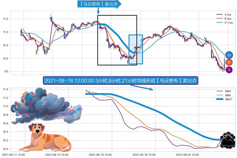 形态多维评估: ⚀ 2021-08-13 14:00:00小时-2021-08-23 10:00:00小时显现 3小时-8小时-21小时均线 【乌云密布】卖出点 看空信号,后市看跌,卖出