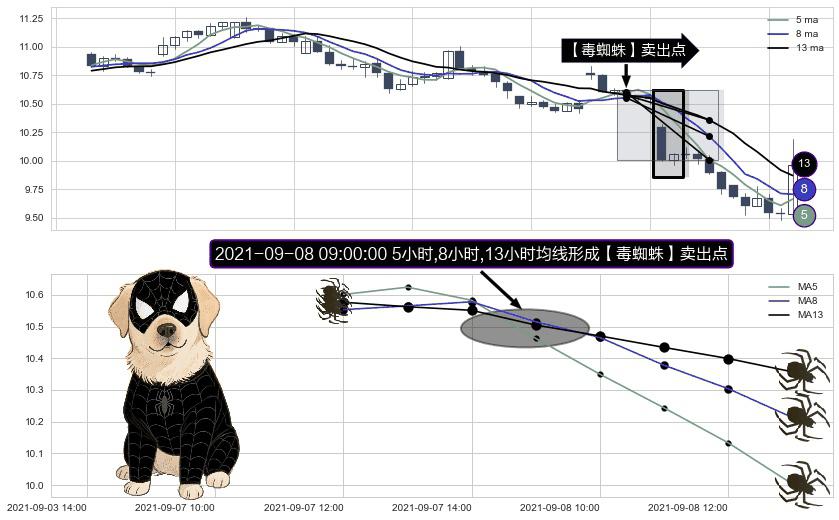 形态多维评估: ⚀ 2021-09-08 09:00:00小时显现 5小时-8小时-13小时均线 【毒蜘蛛】卖出点 看空信号,后市看跌,卖出