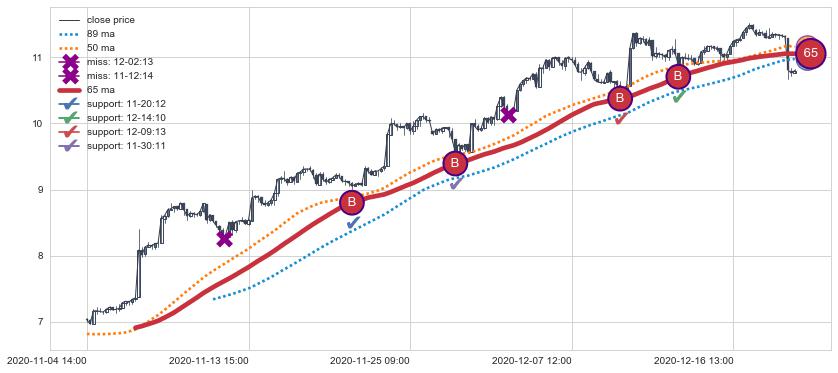 上涨趋势11-04 14:00-12-21 11:00,均线65确认关键支撑4处