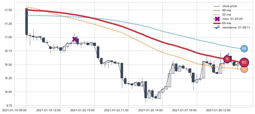 下跌趋势01-15 09:00-01-28 15:00,均线65确认关键阻力1处