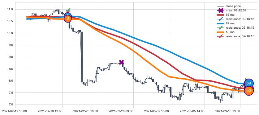 下跌趋势02-12 13:00-03-11 09:00,均线89, 65, 50确认关键阻力1处