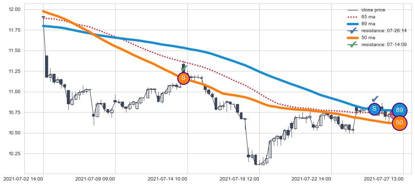 下跌趋势07-02 14:00-07-27 13:00,均线89, 50确认关键阻力2处