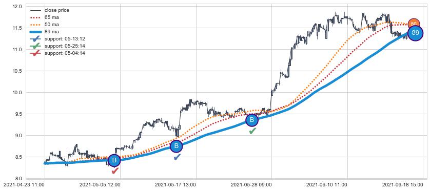 上涨趋势04-23 11:00-06-18 15:00,均线89确认关键支撑3处