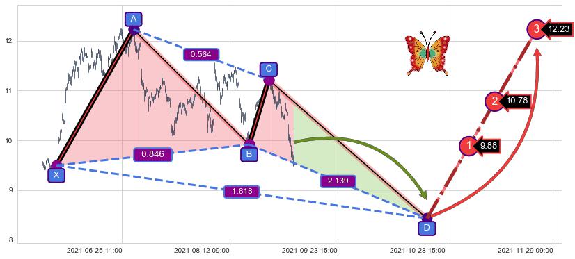➢ 距离预测D点位置有足够的下跌空间, 与看涨【蝴蝶】形态相反,实际方向【看跌】