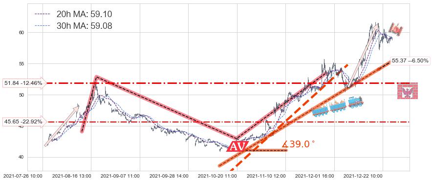 ♘ 支撑价格位51.84,可信任强度66.15%,距离最后交易2021-12-27 15:00形成的收盘价格59.22相差 -12.46%