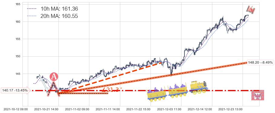 ♘ 在最后的上升阶段2021-10-21 14:00至2021-12-27 15:00存在 持续未破位的支撑位 ,支撑价格148.20,支撑可信任强度85.33%,其距离最后价格161.96相差 -8.49%