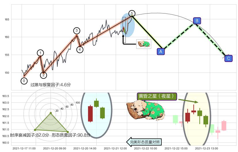 从2021-12-21 14:00至2021-12-23 12:00,共包含13个小时,阶段股价上涨0.10%,阶段股价变动位移路程比: 1 : 32