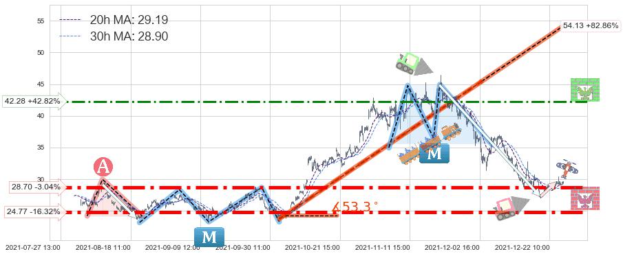 ♘ 支撑价格位28.70,可信任强度90.91%,距离最后交易2021-12-27 15:00形成的收盘价格29.60相差 -3.04%