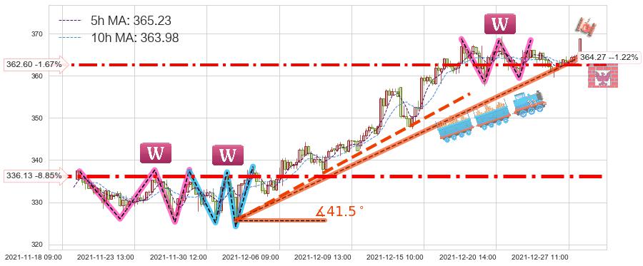 从2021-12-01 15:00至2021-12-27 15:00,共包含120个小时,阶段股价上涨12.62%,阶段股价变动位移路程比: 1 : 3,上涨趋势角度: 41.5