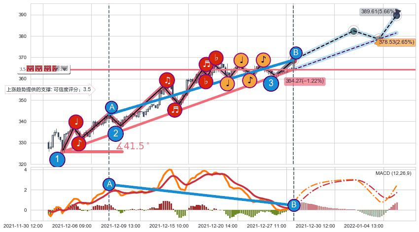 ➣ 预测:2022-01-04 11:00,【试探支撑】稳定目前上涨趋势的前提下,预测价格:378.53