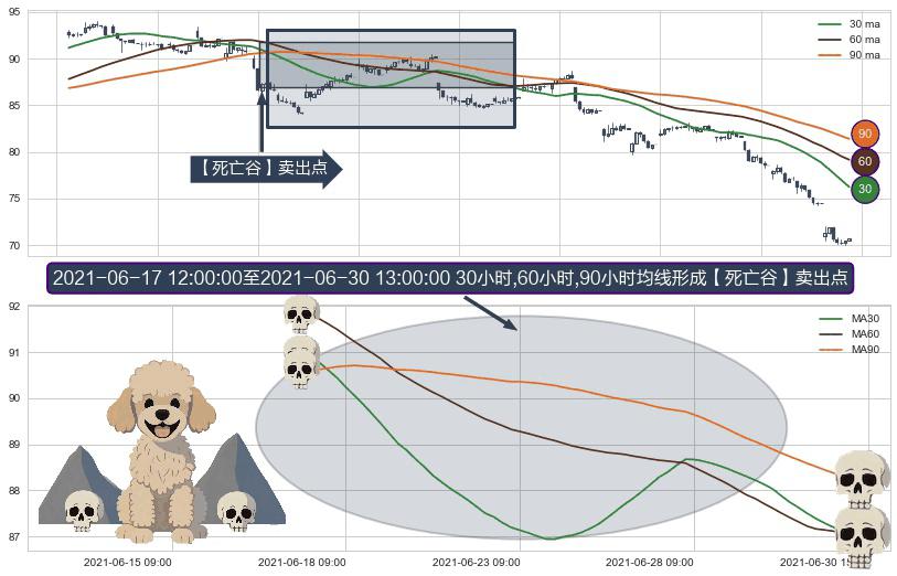 ⚀ 2021-06-17 13:00:00-小时至2021-06-30 13:00:00-小时显现 30小时-60小时-90小时均线 【死亡谷】卖出点 看空信号,后市看跌,卖出