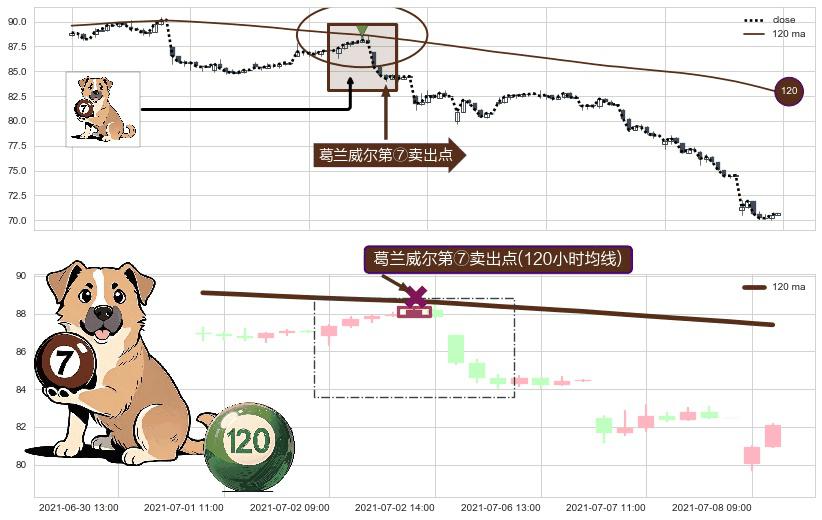 ⚀ 2021-07-02 13:00:00-小时显现 葛兰威尔均线 120小时均线 第⑦卖出点 下降趋势的中继信号,后市看跌,卖出信号