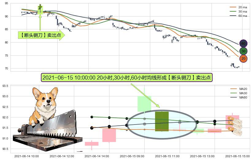 ⚀ 2021-06-15 10:00:00小时显现 20小时-30小时-60小时均线 【断头铡刀】卖出点 看空信号,后市看跌,卖出