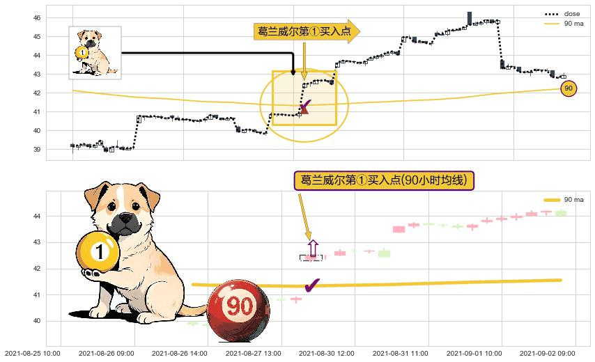 ⚀ 2021-08-30 09:00:00-小时显现 葛兰威尔均线 90小时均线 第买①入点 走势反转见底信号,后市看涨,买进信号