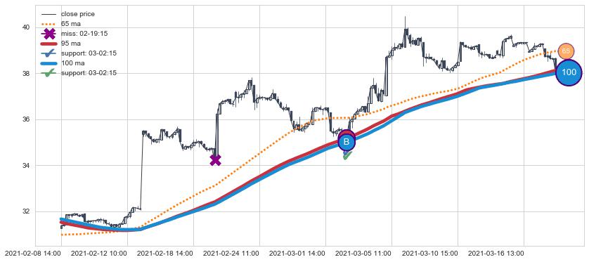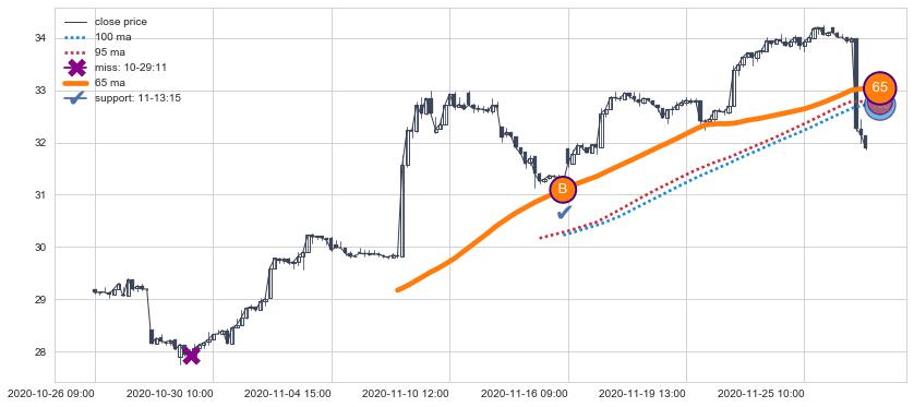 ⚅ 买点向上突破均线后,价格走势有持续向上的迹象,但动能稍显不足,迟迟不能远离均线