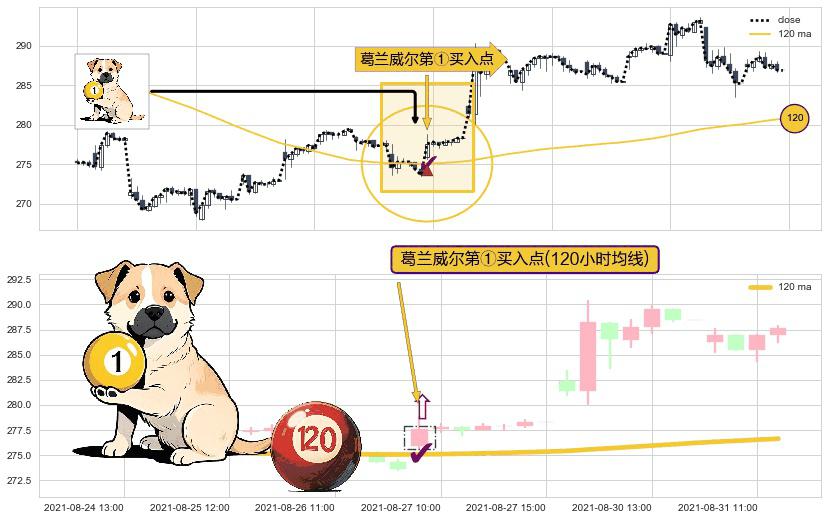 ⚀ 2021-08-27 09:00:00-小时显现 葛兰威尔均线 120小时均线 第买①入点 走势反转见底信号,后市看涨,买进信号