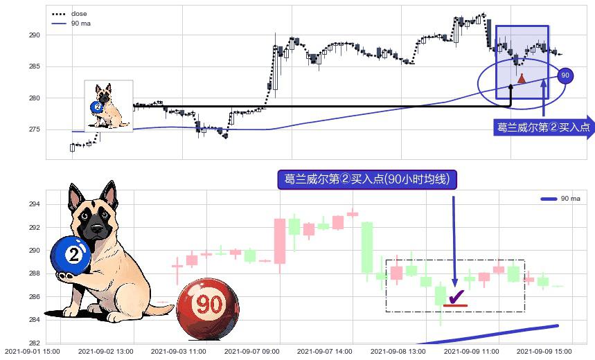 ⚀ 2021-09-08 15:00:00-小时显现 葛兰威尔均线 90小时均线 第②买入点 上升趋势的中继信号,后市看涨,买进信号