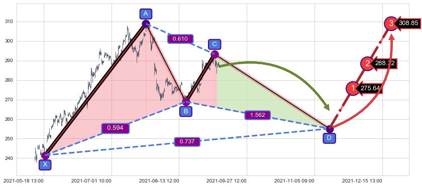 ➣ D点拟合预测价格255.11,距离最后交易收盘价格286.88相差 -11.07%