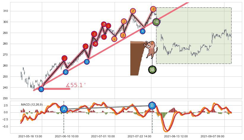 从2021-05-13 12:00至2021-07-29 09:00,共包含350个小时,阶段股价上涨19.50%,阶段股价变动位移路程比: 1 : 6,上涨趋势角度: 55.1