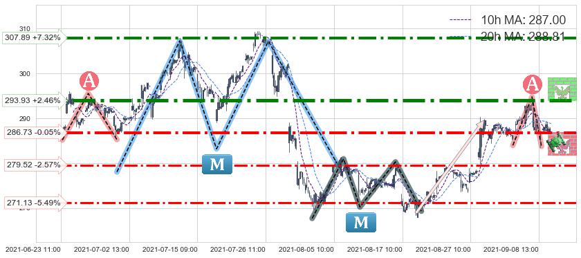 ♘ 阻力价格位293.93,可信任强度90.00%,距离最后交易2021-09-09 15:00形成的收盘价格286.88相差 +2.46%