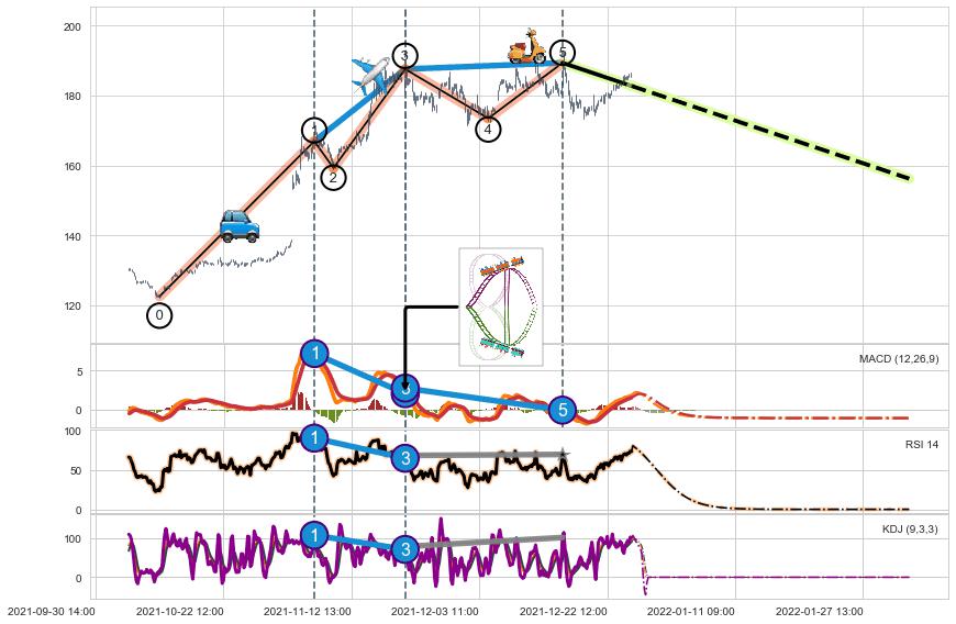 ➣ 1,3,5驱动浪MACD, RSI, KDJ走势都出现【常规背离】反转信号增强