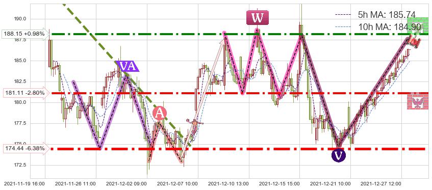 ♘ 阻力价格位188.15,可信任强度81.61%,距离最后交易2021-12-27 16:00形成的收盘价格186.33相差 +0.98%
