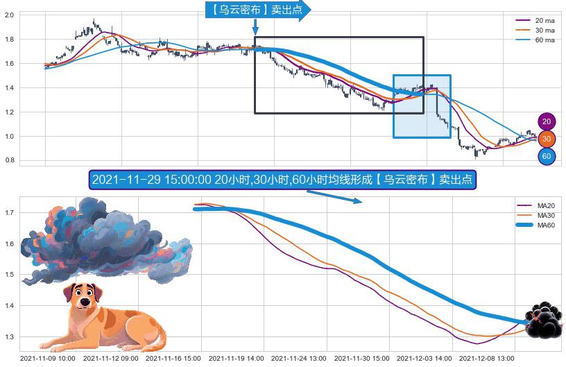 ⚀ 2021-11-16 13:00:00小时-2021-12-09 13:00:00小时显现 20小时-30小时-60小时均线 【乌云密布】卖出点 看空信号,后市看跌,卖出