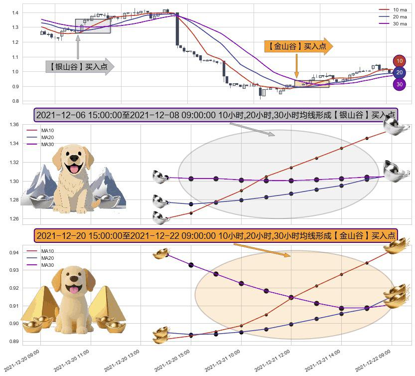 ⚀ 2021-12-21 09:00:00-小时至2021-12-22 09:00:00-小时显现 10小时-20小时-30小时均线 【金山谷】买入点 其再次确认了买入信号,可靠性更强,买入