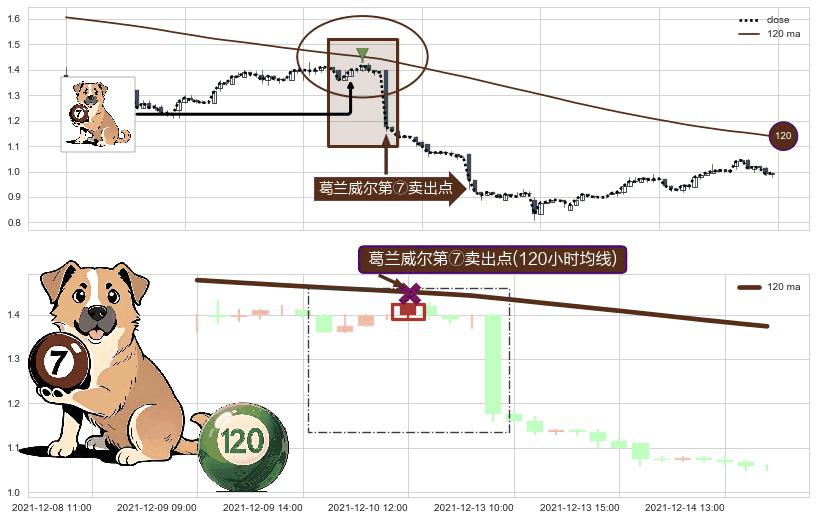 ⚀ 2021-12-10 12:00:00-小时显现 葛兰威尔均线 120小时均线 第⑦卖出点 下降趋势的中继信号,后市看跌,卖出信号