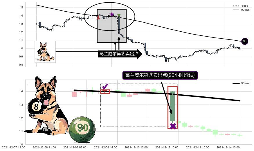 ⚀ 2021-12-13 09:00:00-小时显现 葛兰威尔均线 90小时均线 第⑧卖出点 下降趋势的中继信号,后市看跌,卖出信号