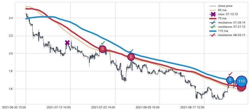 ⚅ 卖点向下突破均线后,价格走势有持续向下的迹象,但动能稍显不足,迟迟不能远离均线