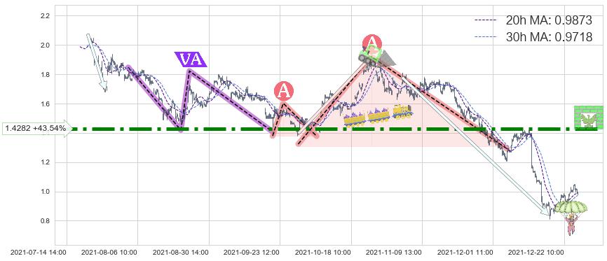 从2021-11-03 10:00至2021-12-27 15:00,共包含248个小时,阶段股价下跌-53.36%,阶段股价变动位移路程比: 1 : 5