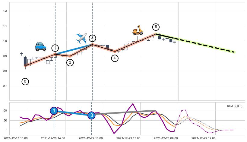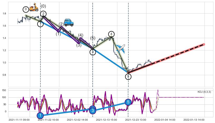 ➢ 第一, 三驱动浪端点:【KDJ】走势出现【常规背离 & 反转信号】背离程度67.65%,背离夹角角度76.0˚,背离程度较大