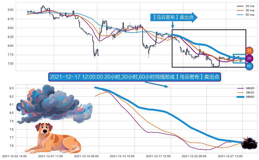 ⚀ 2021-12-09 14:00:00小时-2021-12-27 15:00:00小时显现 20小时-30小时-60小时均线 【乌云密布】卖出点 看空信号,后市看跌,卖出