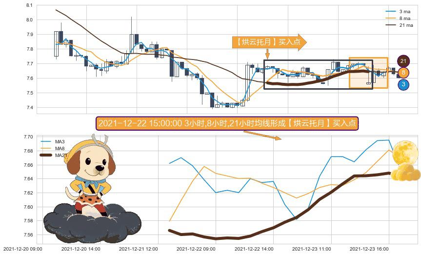 ⚀ 2021-12-21 13:00:00小时-2021-12-27 09:00:00小时显现 3小时-8小时-21小时均线 【烘云托月】买入点 看多信号,后市看涨,买入