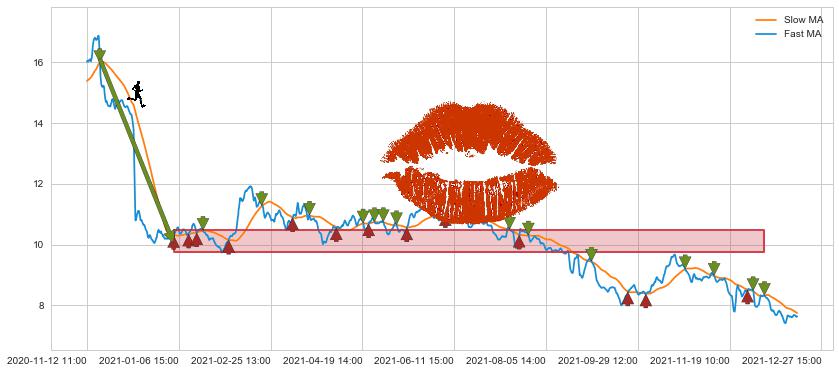 ⚅ 卖点向下突破均线后,价格走势有持续向下的迹象,但动能稍显不足,迟迟不能远离均线