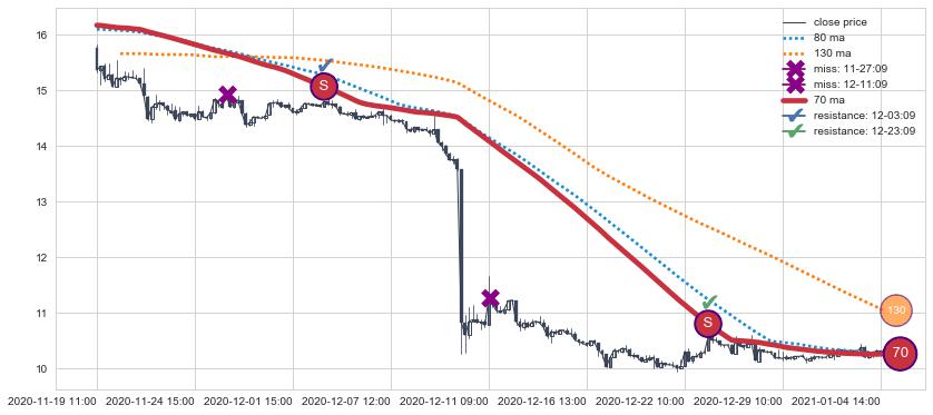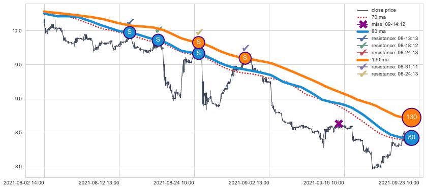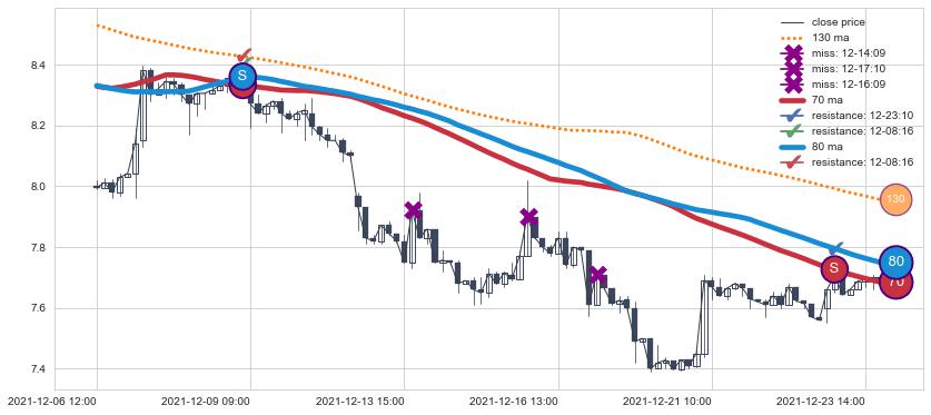 ⚂ 2021-12-23 10:00:00-小时均线向上突破,2021-12-27 14:00:00-小时重新下穿均线破位,均线阻力再次生效
