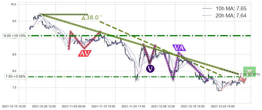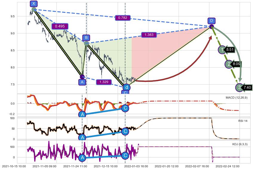 ➣ D点拟合预测价格9.20,距离最后交易收盘价格7.60相差 +21.03%