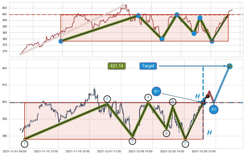 ➢ 最后的上涨趋势2021-10-15 10:00至2021-12-01 14:00:存在破位迹象,后续小调整或者反转下跌