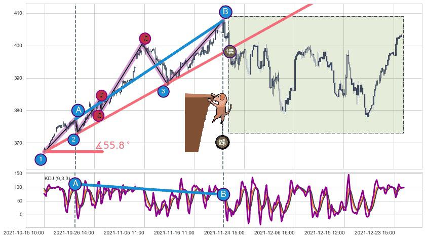 从2021-10-15 10:00至2021-12-01 14:00,共包含226个小时,阶段股价上涨7.04%,阶段股价变动位移路程比: 1 : 7,上涨趋势角度: 55.8