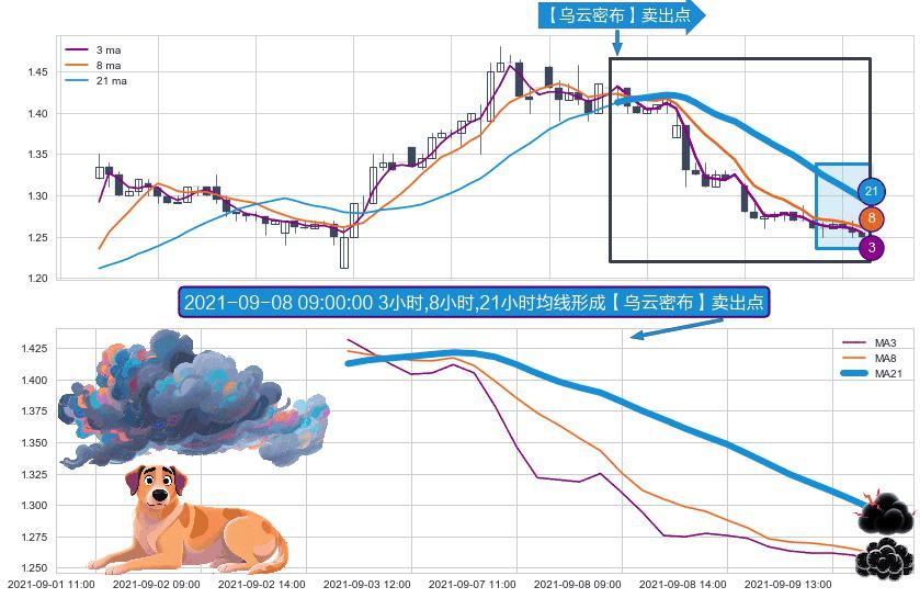 形态多维评估: ⚀ 2021-09-03 09:00:00小时-2021-09-09 15:00:00小时显现 3小时-8小时-21小时均线 【乌云密布】卖出点 看空信号,后市看跌,卖出