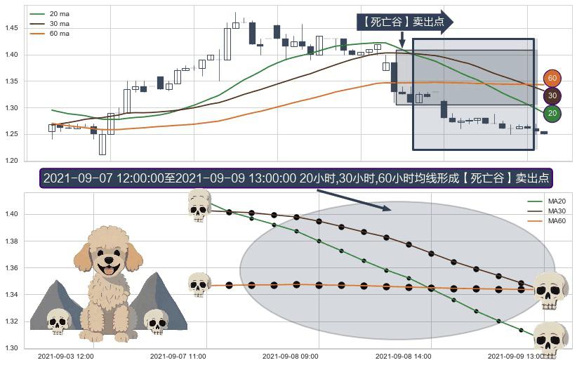 形态多维评估: ⚀ 2021-09-07 13:00:00-小时至2021-09-09 13:00:00-小时显现 20小时-30小时-60小时均线 【死亡谷】卖出点 看空信号,后市看跌,卖出