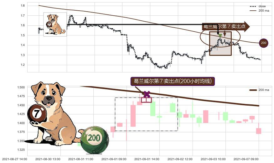 形态多维评估: ⚀ 2021-09-01 12:00:00-小时显现 葛兰威尔均线 200小时均线 第⑦卖出点 下降趋势的中继信号,后市看跌,卖出信号