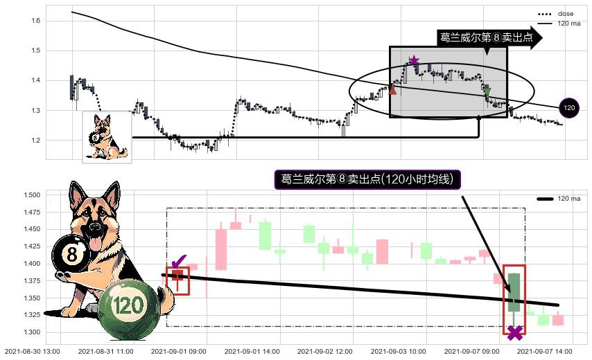 形态多维评估: ⚀ 2021-09-07 10:00:00-小时显现 葛兰威尔均线 120小时均线 第⑧卖出点 下降趋势的中继信号,后市看跌,卖出信号