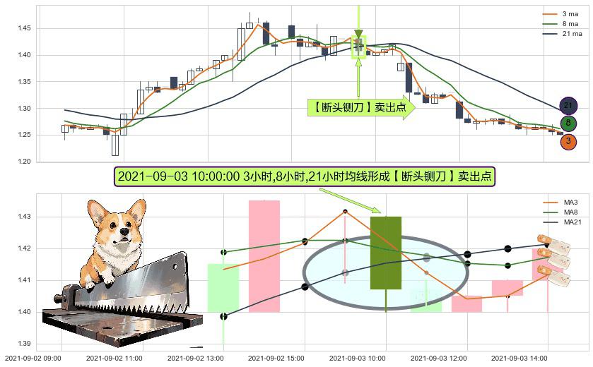 形态多维评估: ⚀ 2021-09-03 10:00:00小时显现 3小时-8小时-21小时均线 【断头铡刀】卖出点 看空信号,后市看跌,卖出