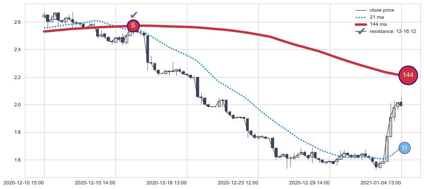 下跌趋势12-10 15:00-01-04 13:00,均线144确认关键阻力1处