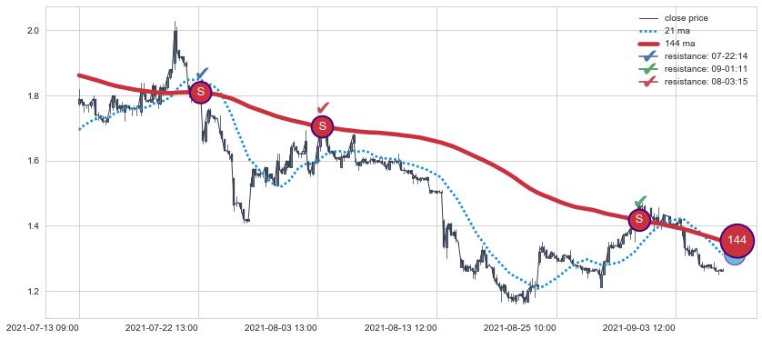 下跌趋势07-13 09:00-09-09 13:00,均线144确认关键阻力3处